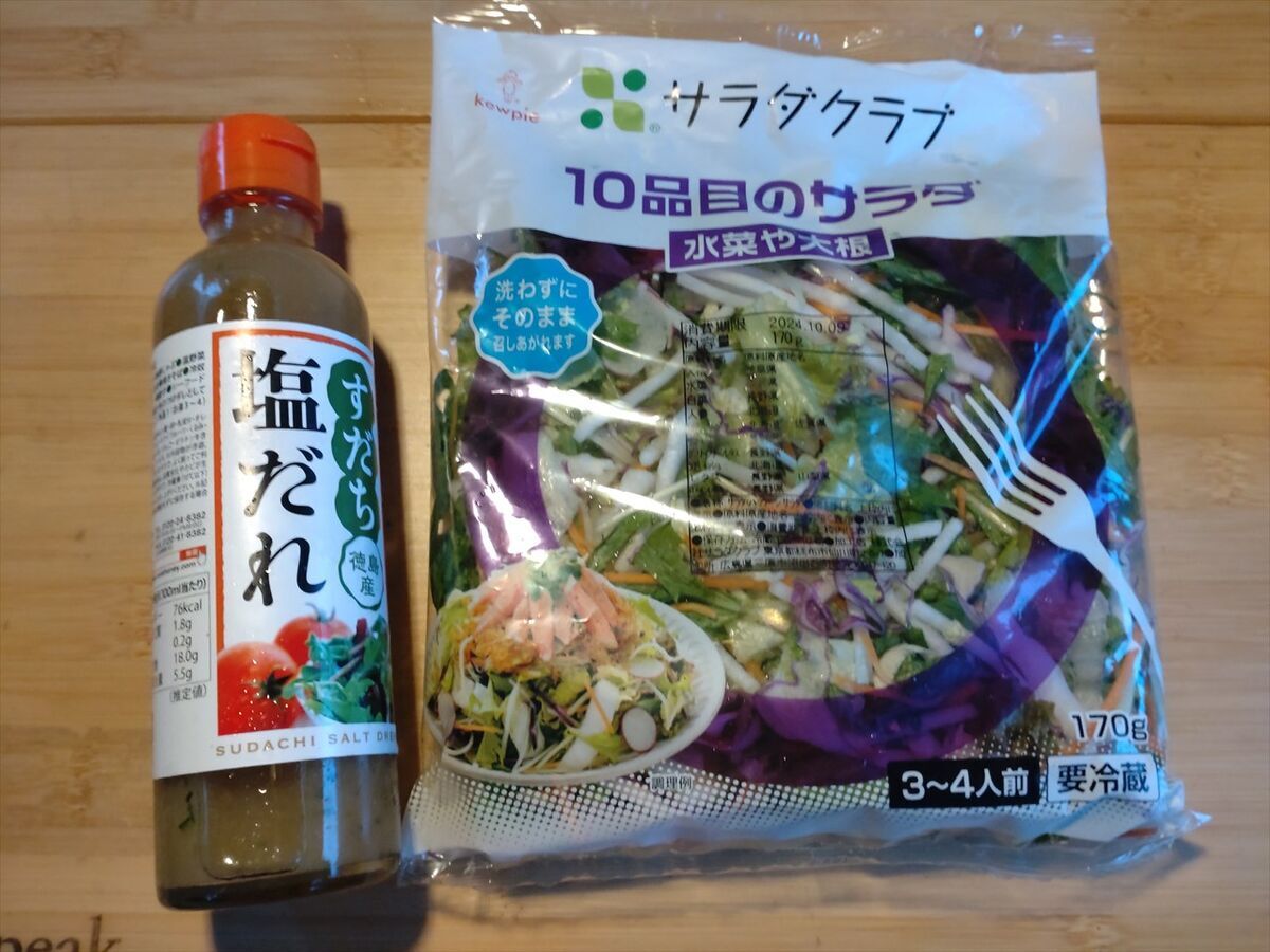 サラダに早速今日買ったすだち塩だれをかけましょう。