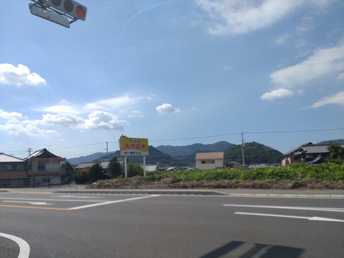 スーパーの後に行くたかせ天然温泉の案内が出ています。