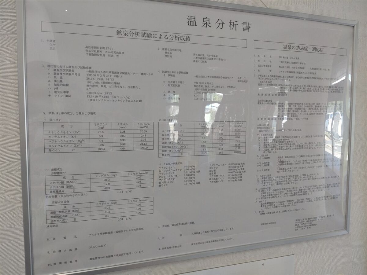温泉分析表です。アルカリ性単純温泉(低張性弱アルカリ性低温泉)と書かれています。