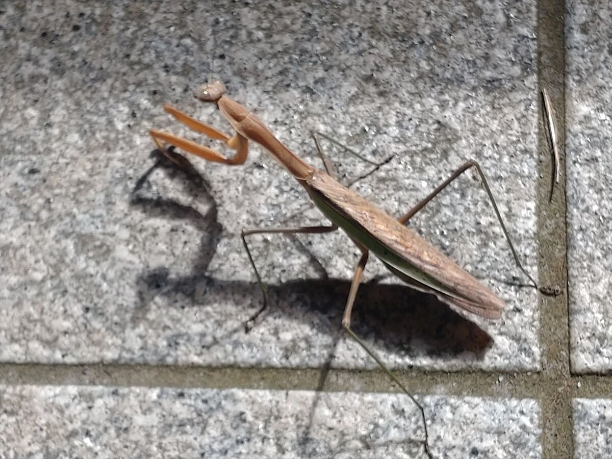 トイレの床に大きなカマキリがじっとしていました。