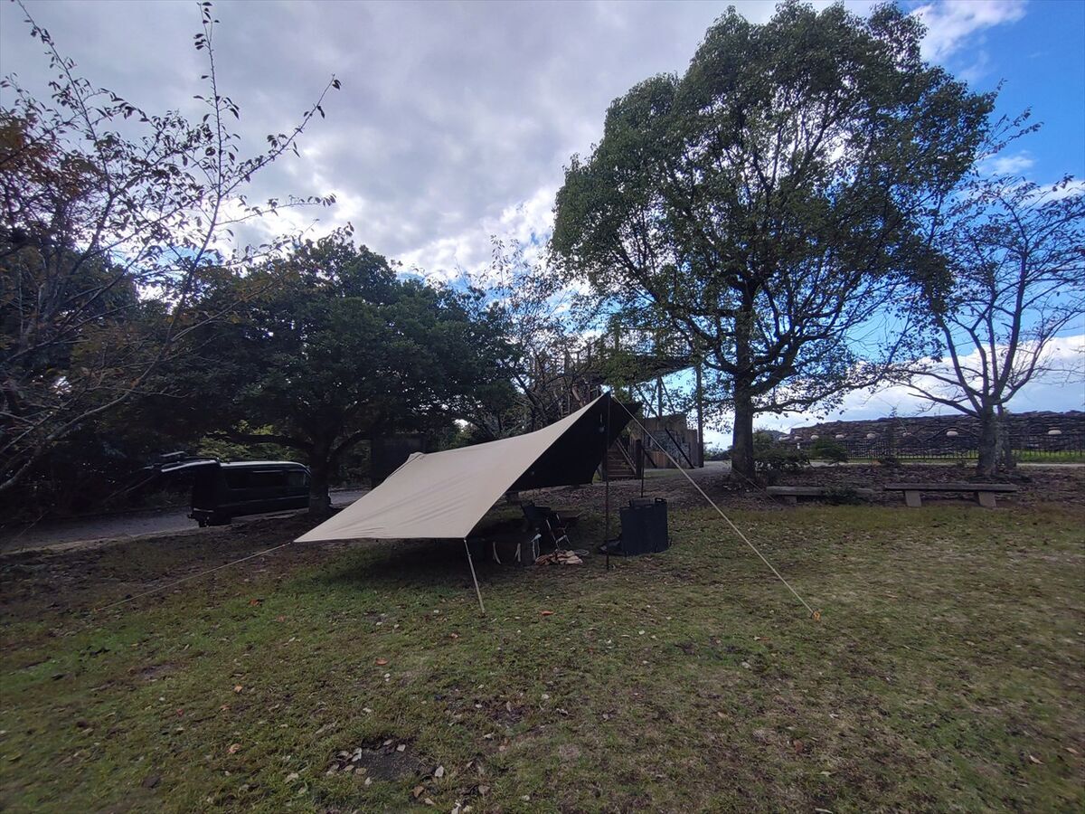 車横付が出来ないのでタープだけ設営して駐車場で車中泊にします。
