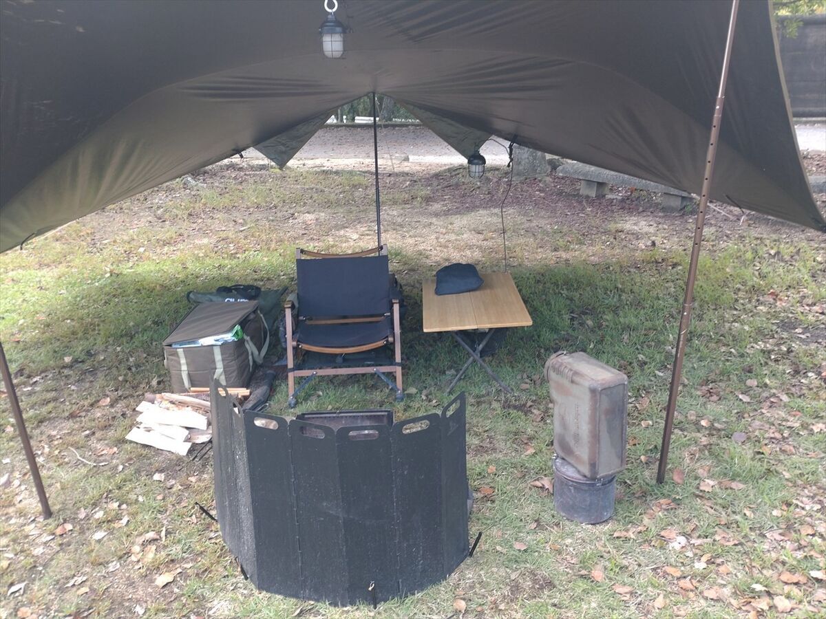 半袖ではさすがに寒いので焚き火ウエアを着て過ごしています。