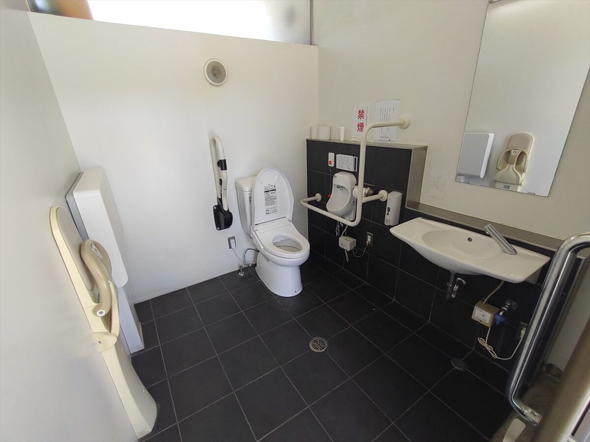 多目的トイレです。新しい感じでキレイなトイレですね。洗浄便座もついていますね(^^)