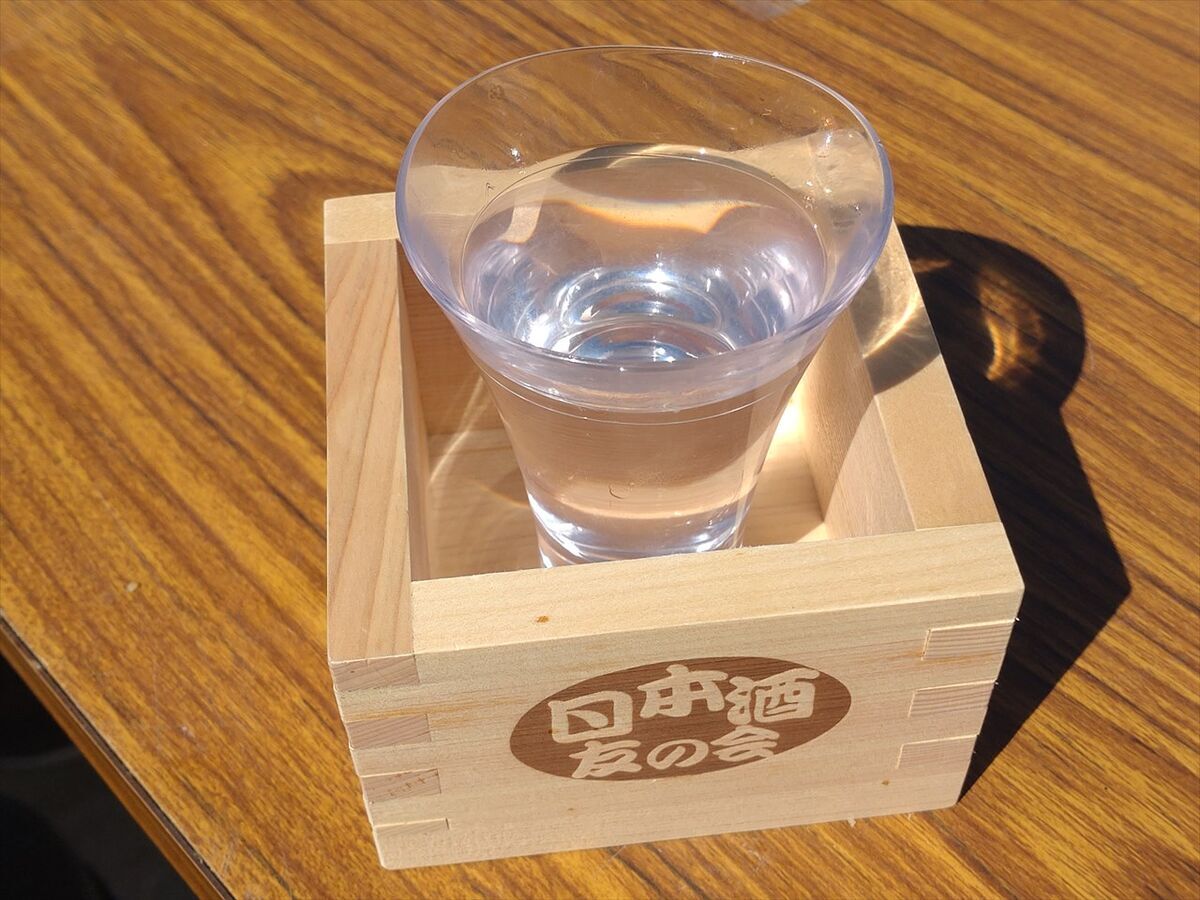 メンバーが作ってくれた特製の桝にグラスを置いてこぼさないように飲んでいます。