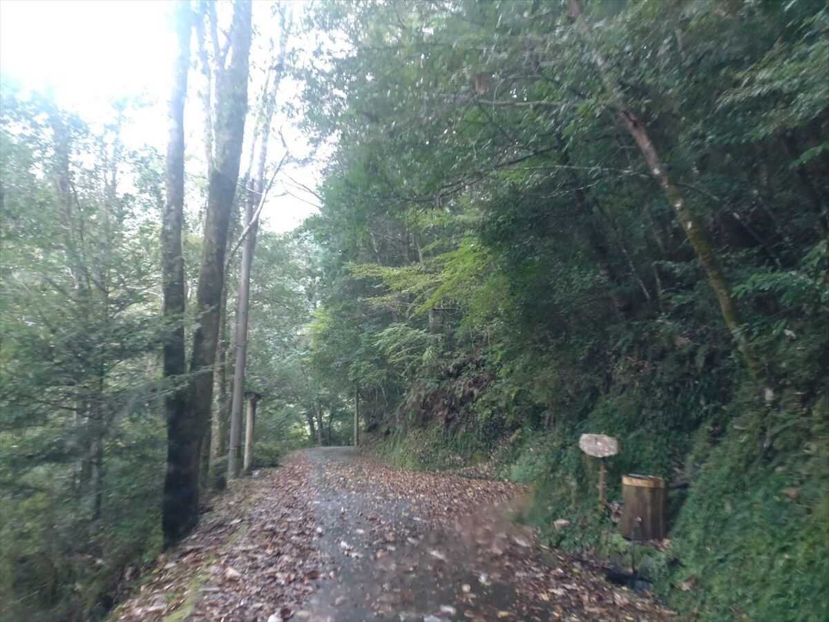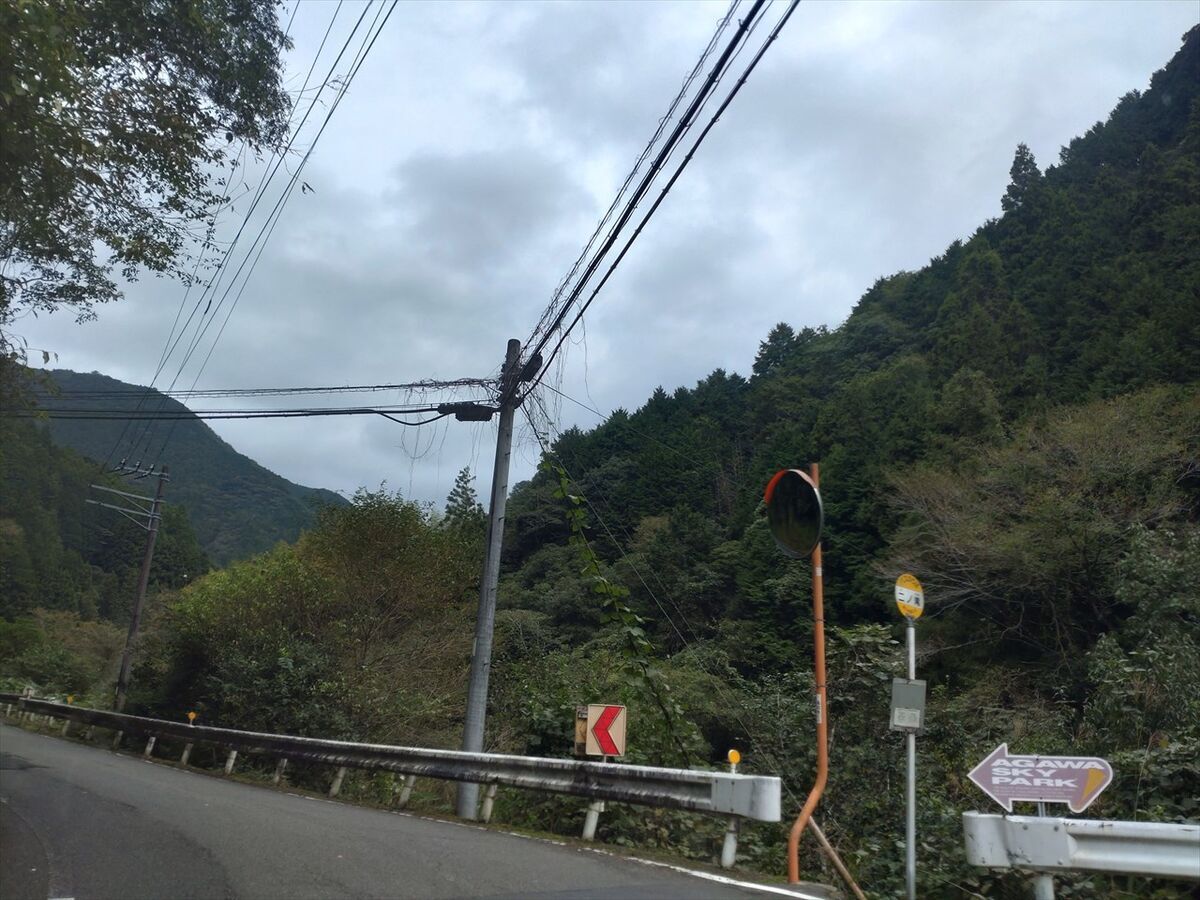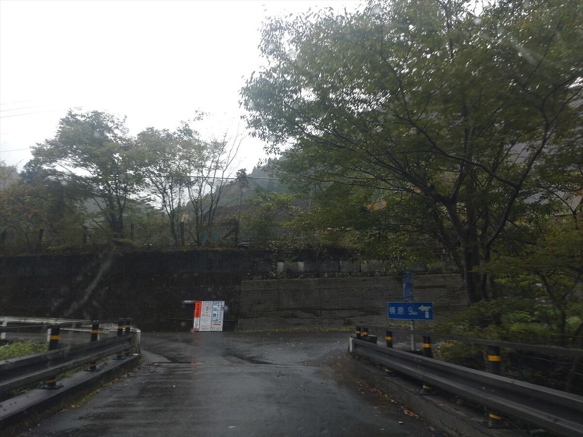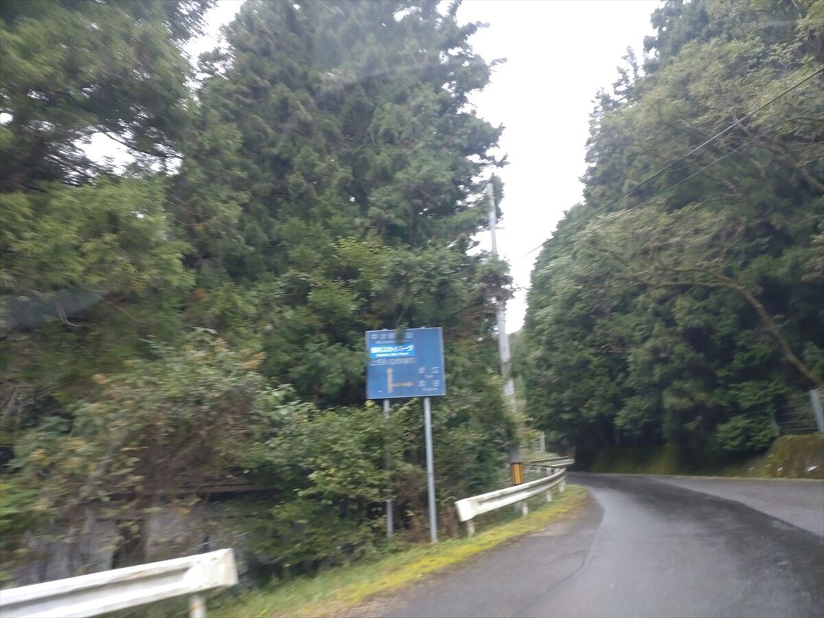 広い道のトンネルを出たすぐの所に出ました。こちら側から入る方が細い道をほとんど運転しなくて良いのですが、トンネル出口に近いので安全のため手前に標識が出ていたのかもしれませんね。