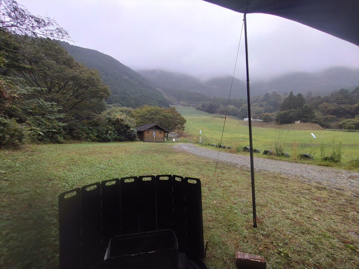 朝起きた時には雨が止んでいましたが撤収する頃には雨が降りだし濡れたタープは泥まみれでした(^^;