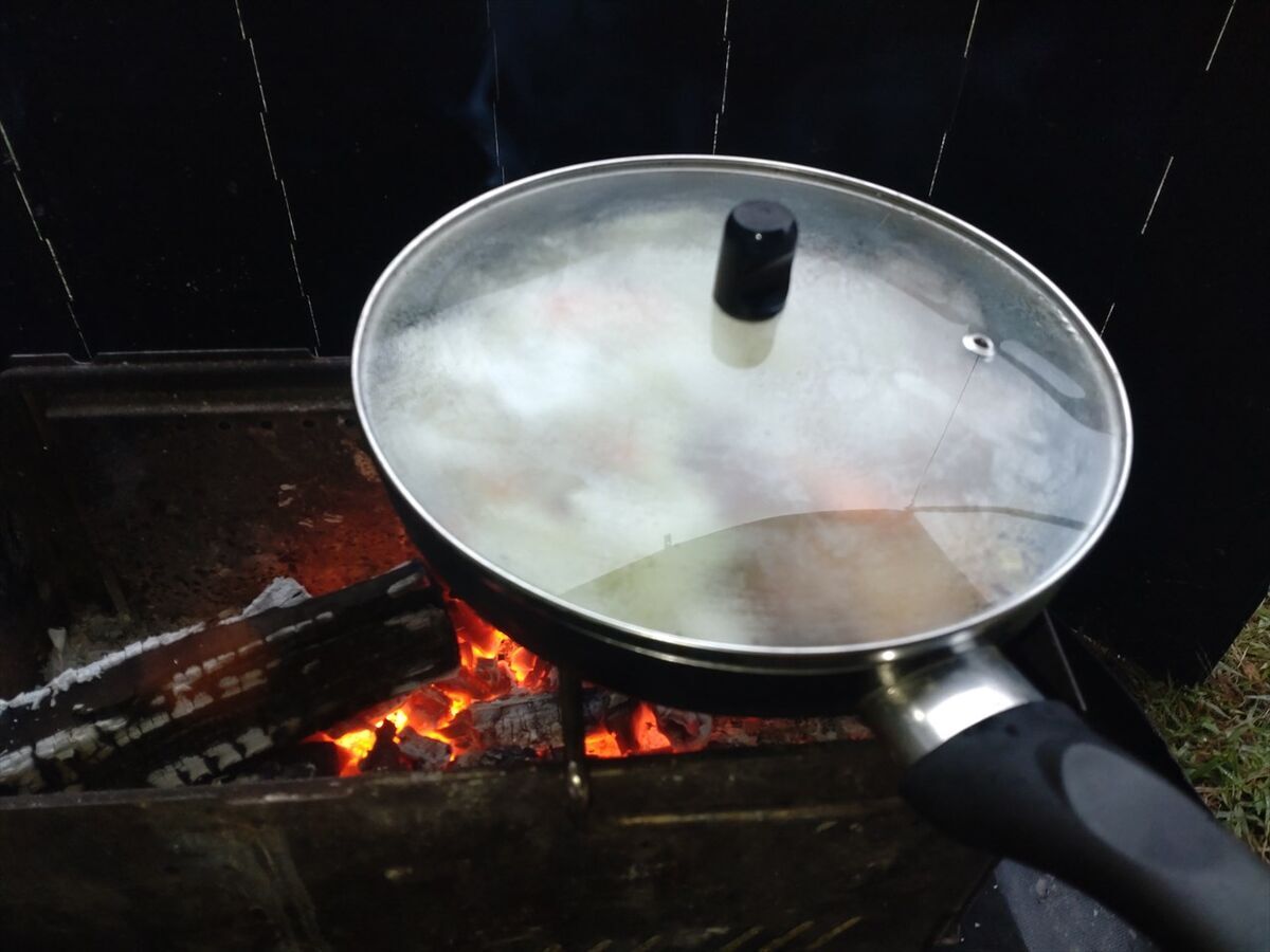 夕方になったので夕食にしましょう。芋炊きを温めます。