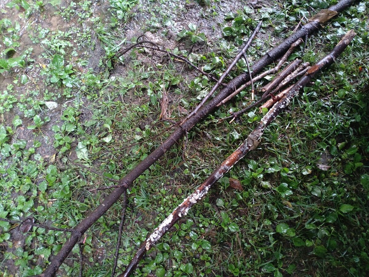 雨で濡れていても仕方ないので薪になりそうな伐採された枝を探してきました。