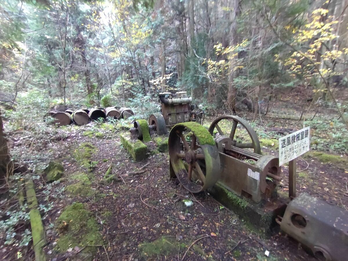 間歩入口の右側には送風機械室跡の機械がそのまま残っています。