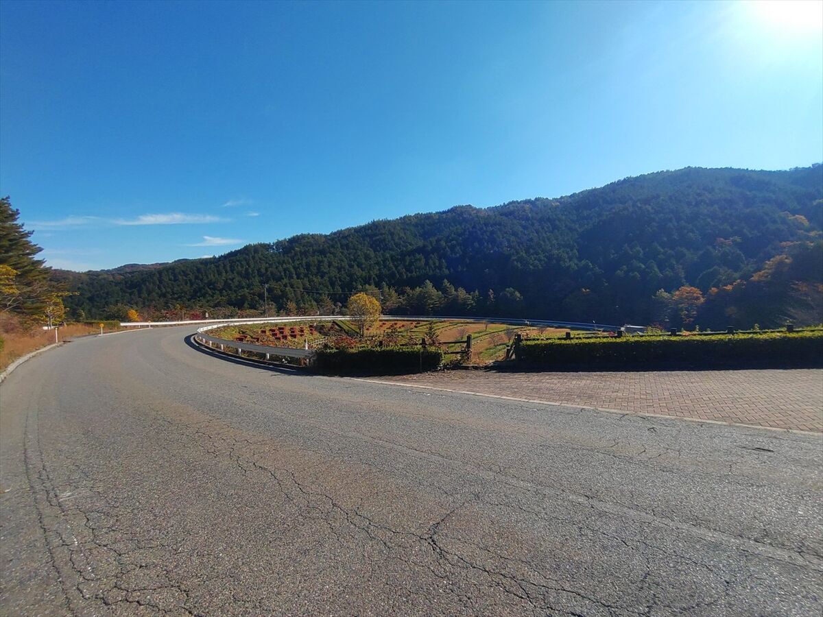 ループ道路の少し先が峠でこれから坂を下って行きます。