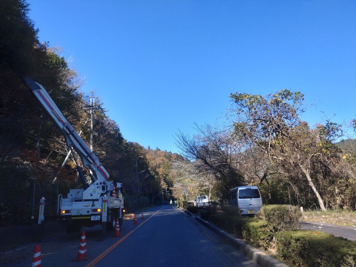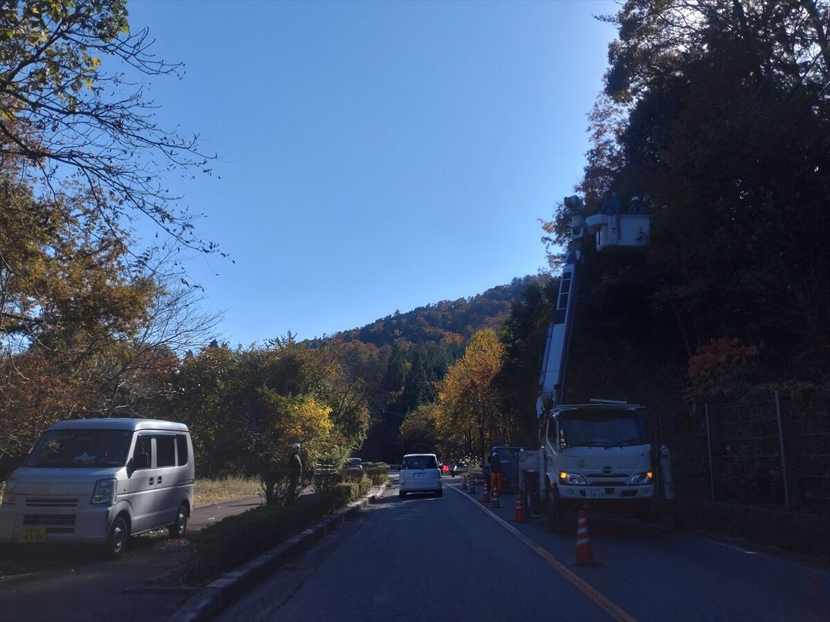 片側交互通行にして道路にはみ出た木の伐採作業が行われています。