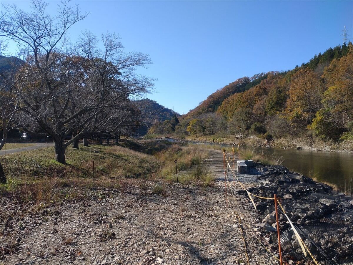 この広場は通って来た道路から離れるので良さそうなのですが、川向きに設営すると前に通路がありキャンプ利用者の車が通るのが見えるので気に入りません(^^;