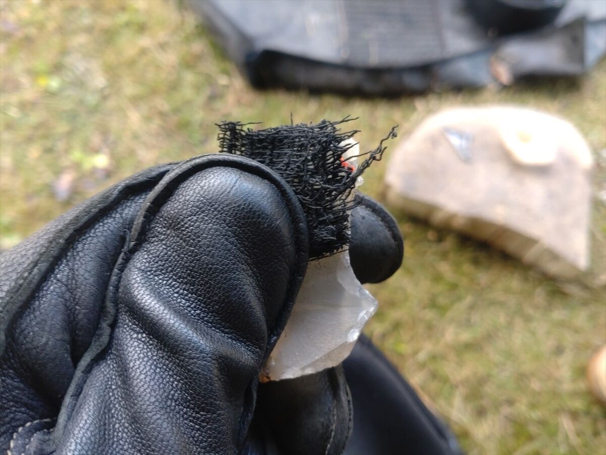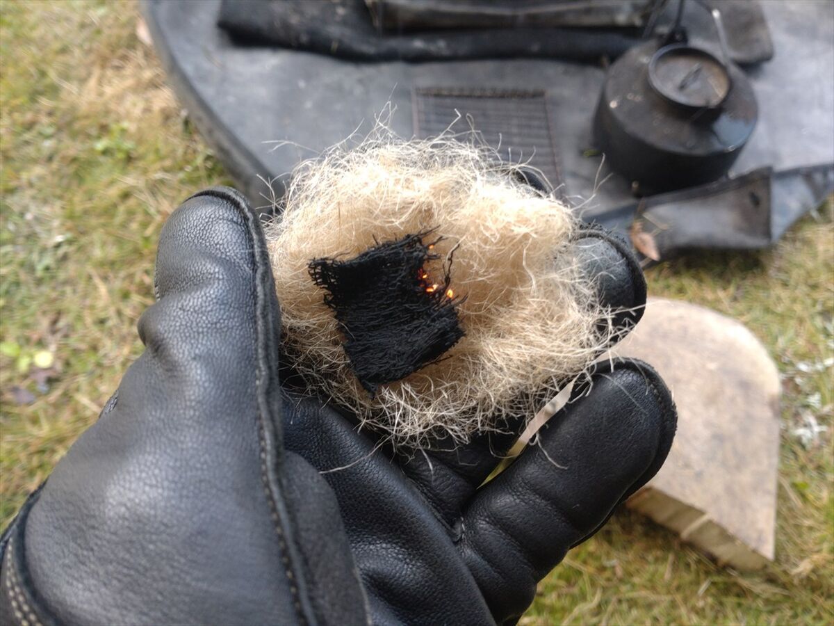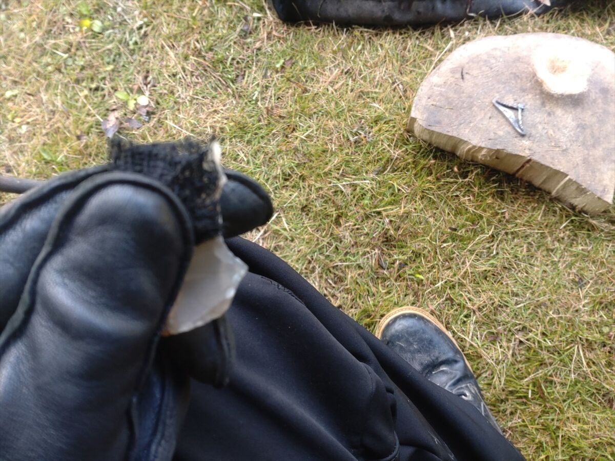 最近はチャークロスを半分にちぎって火打石の上に乗せ、手をチェアに座った左ひざの上に置き下に下がらないように固定して、火打ち鎌を打ち当てています。