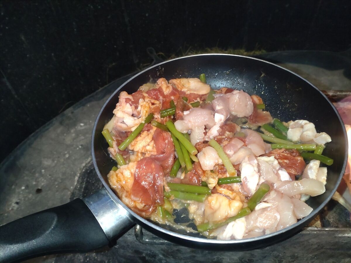 昨日の残りの鶏肉も一緒に入れます。