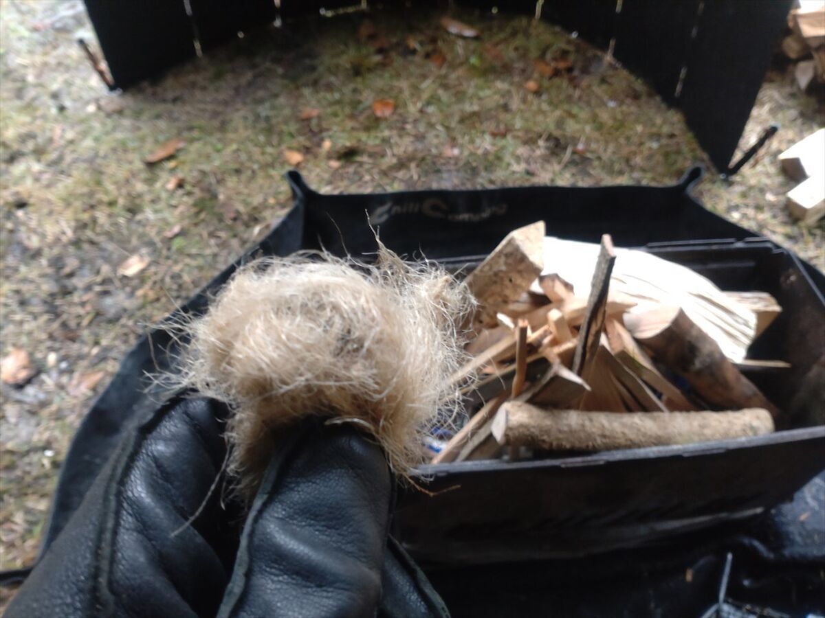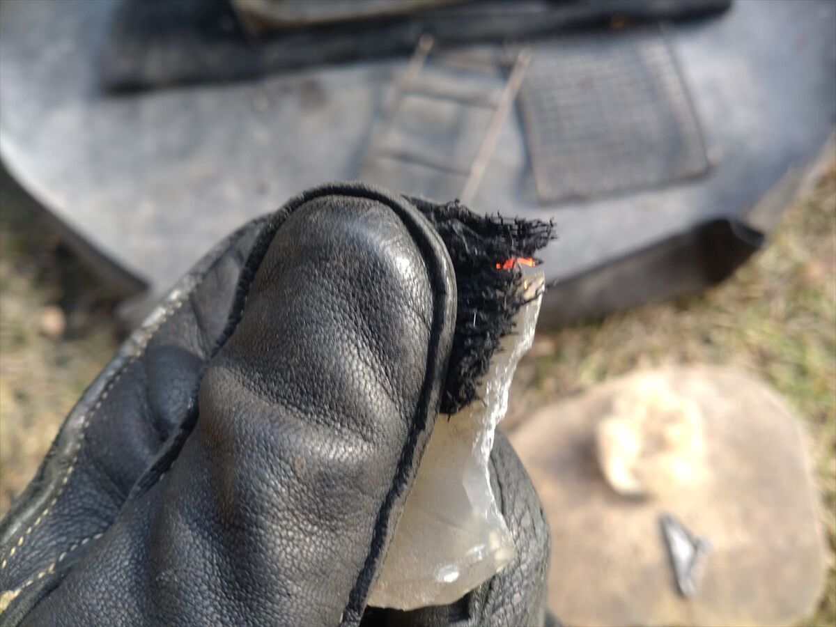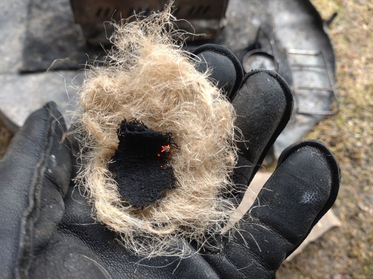 麻の上にチャークロスを置いてもう少し火を広げようと息を吹きかけたら、そのまま麻から炎が上がってしまいました。こんなに火の着きが良い時もあるのですね(^^)