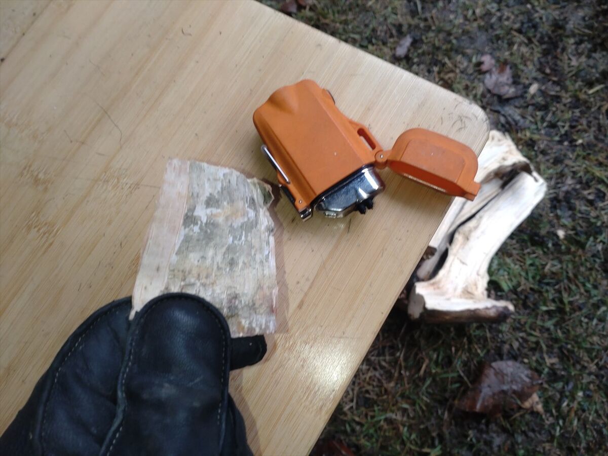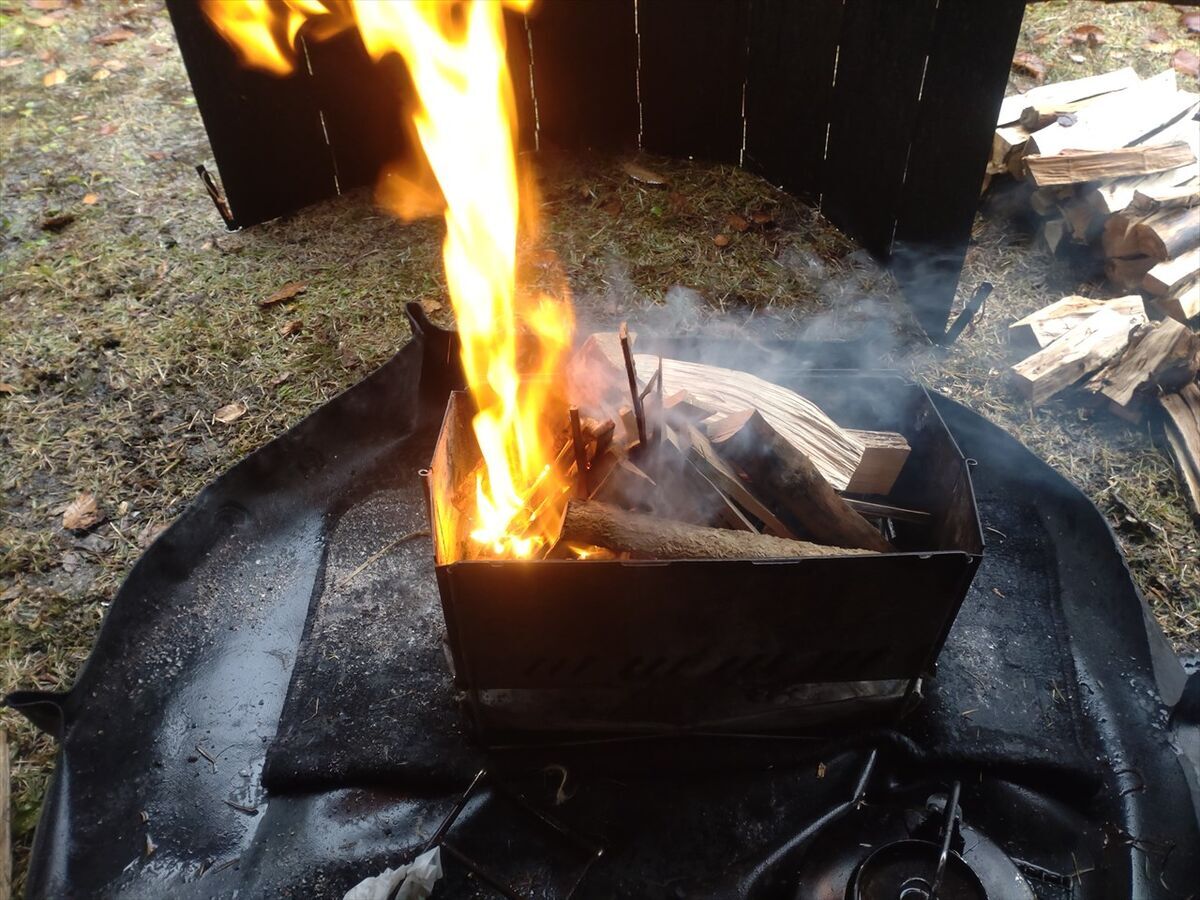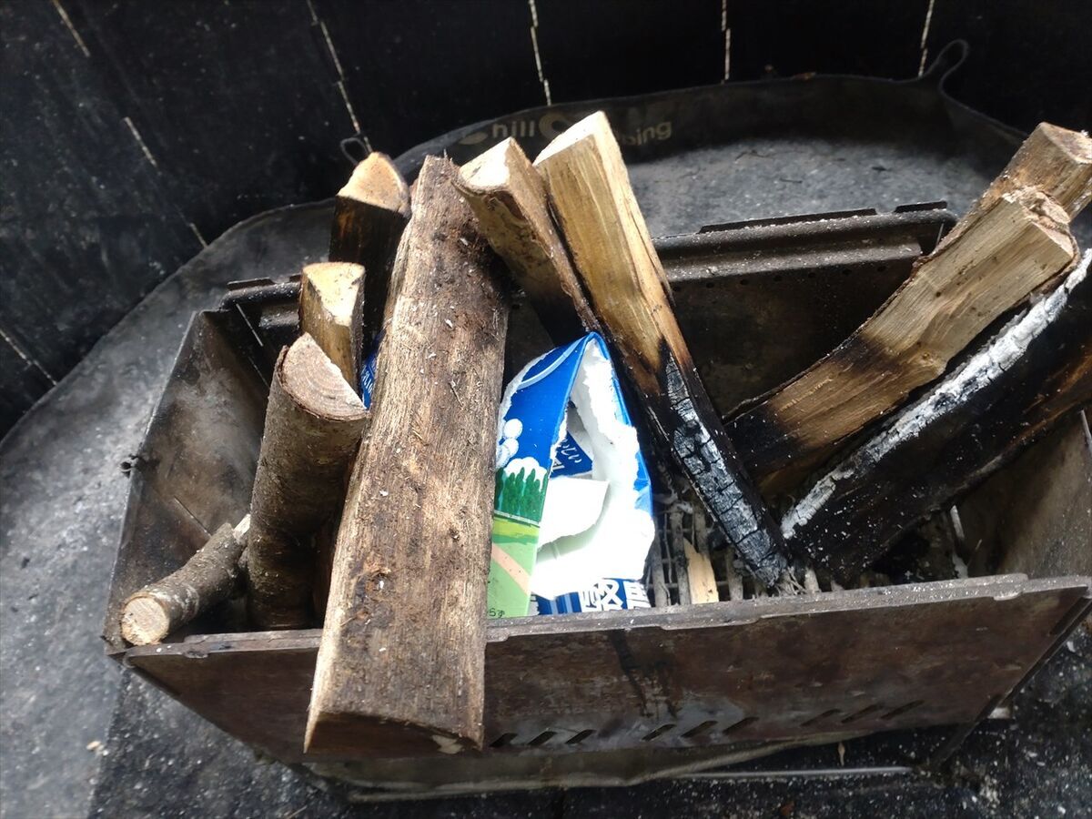 銀杏の皮を剝いているうちにまた焚き火が消えていたので再度起こし直しています(^^)