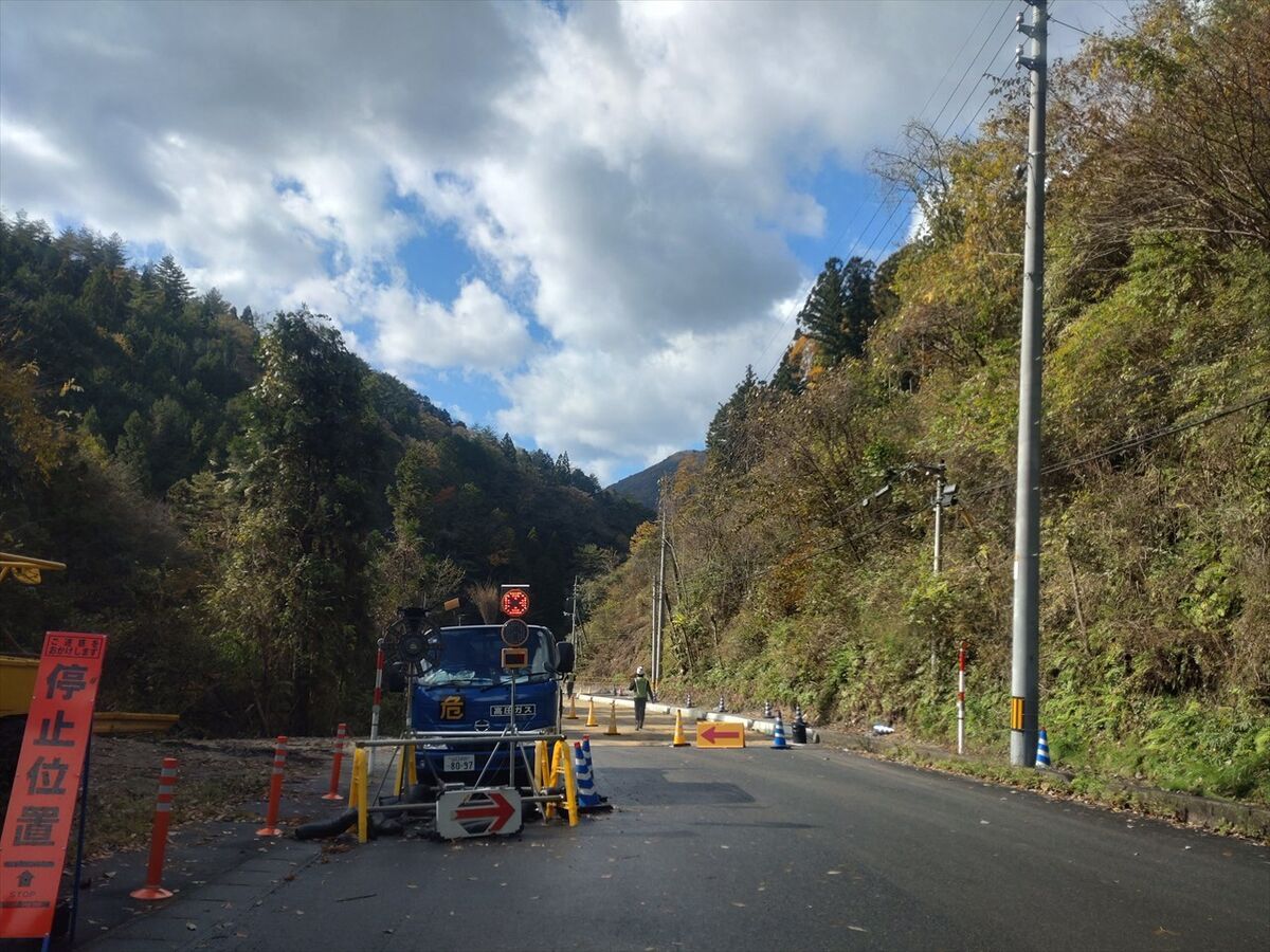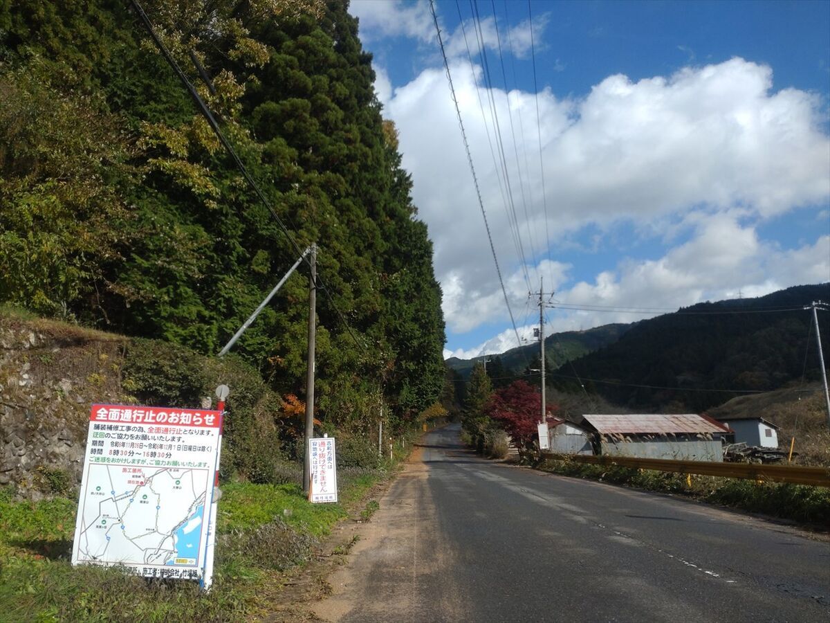 ここにも全面通行止めの案内があります。車を停めてみるとこの先で全面通行止めで近くにはう回路が無く、大回りをするようです(^^;