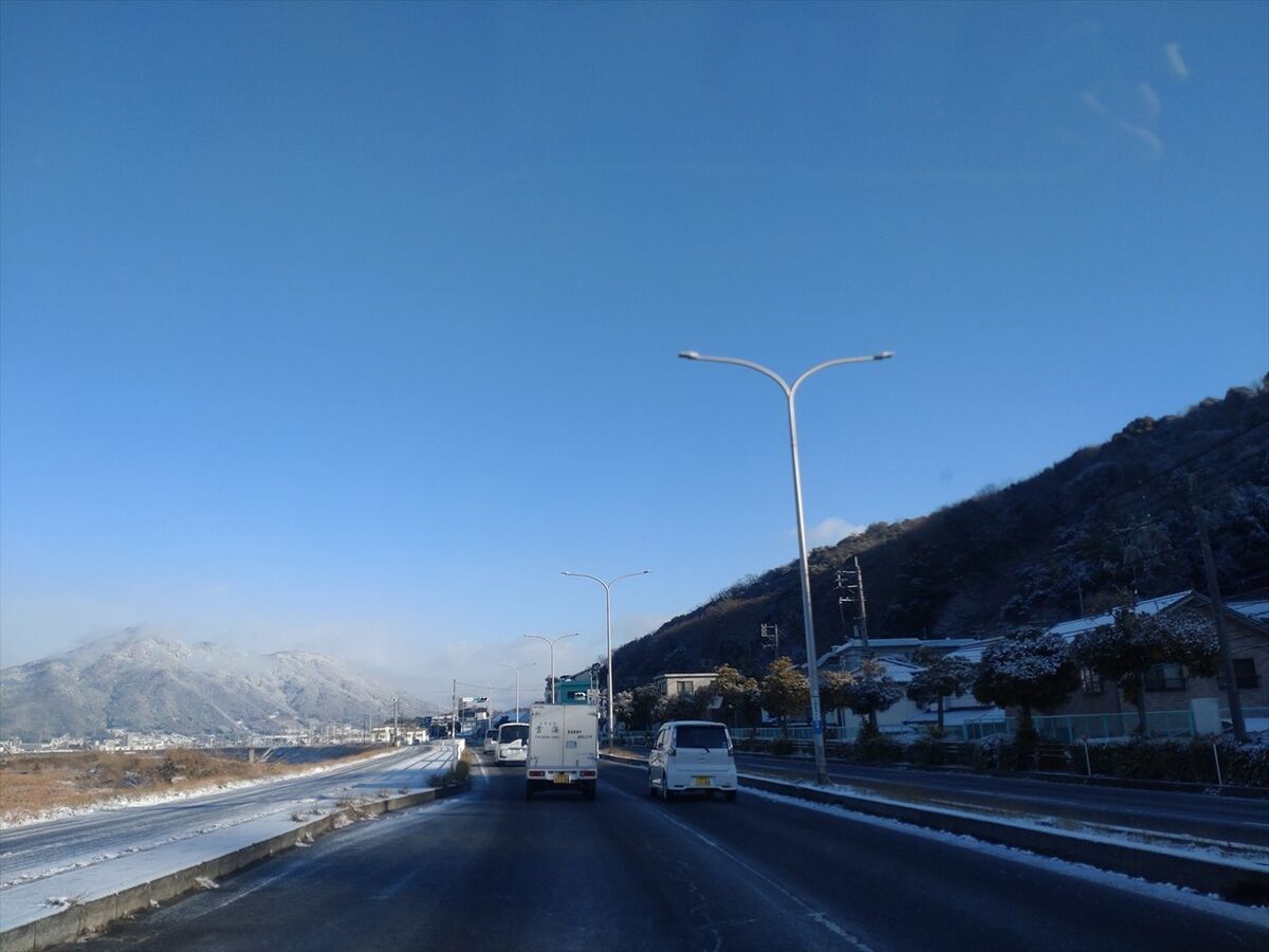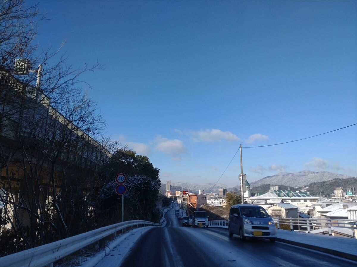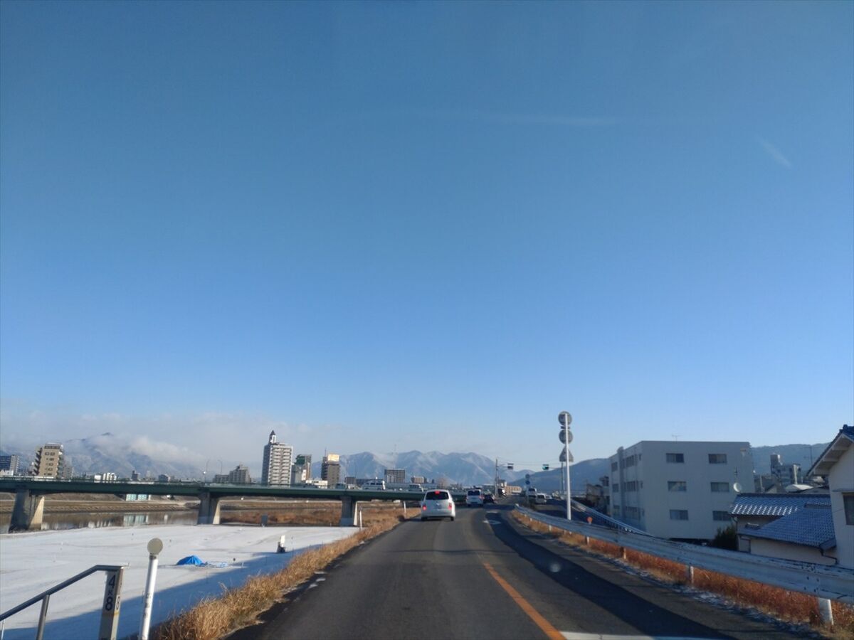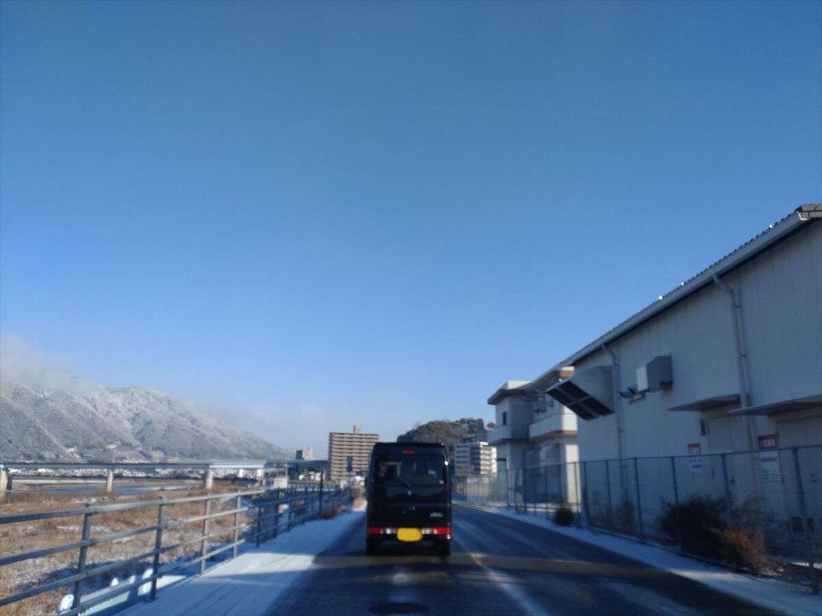 太田川の河川敷や向こうの山は真っ白ですが道路に雪はありませんね。