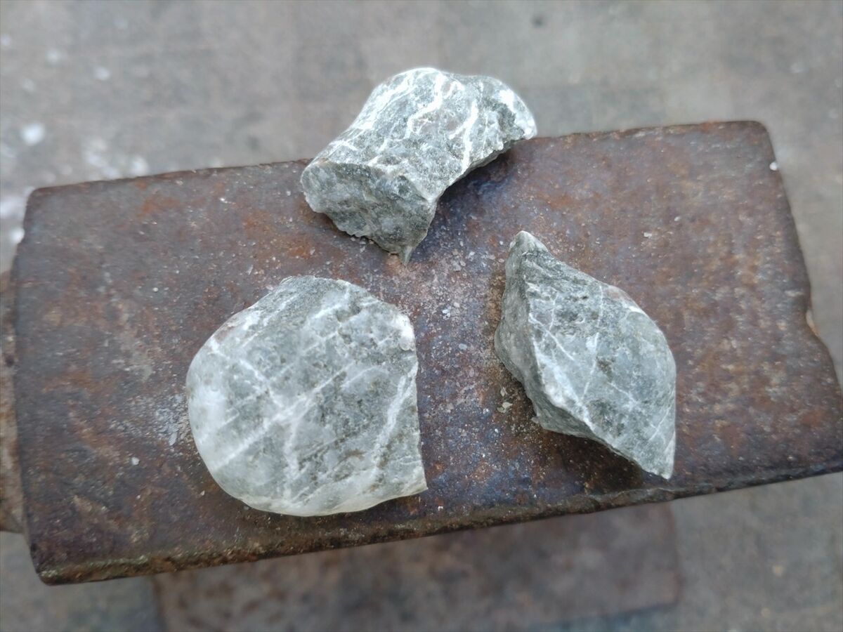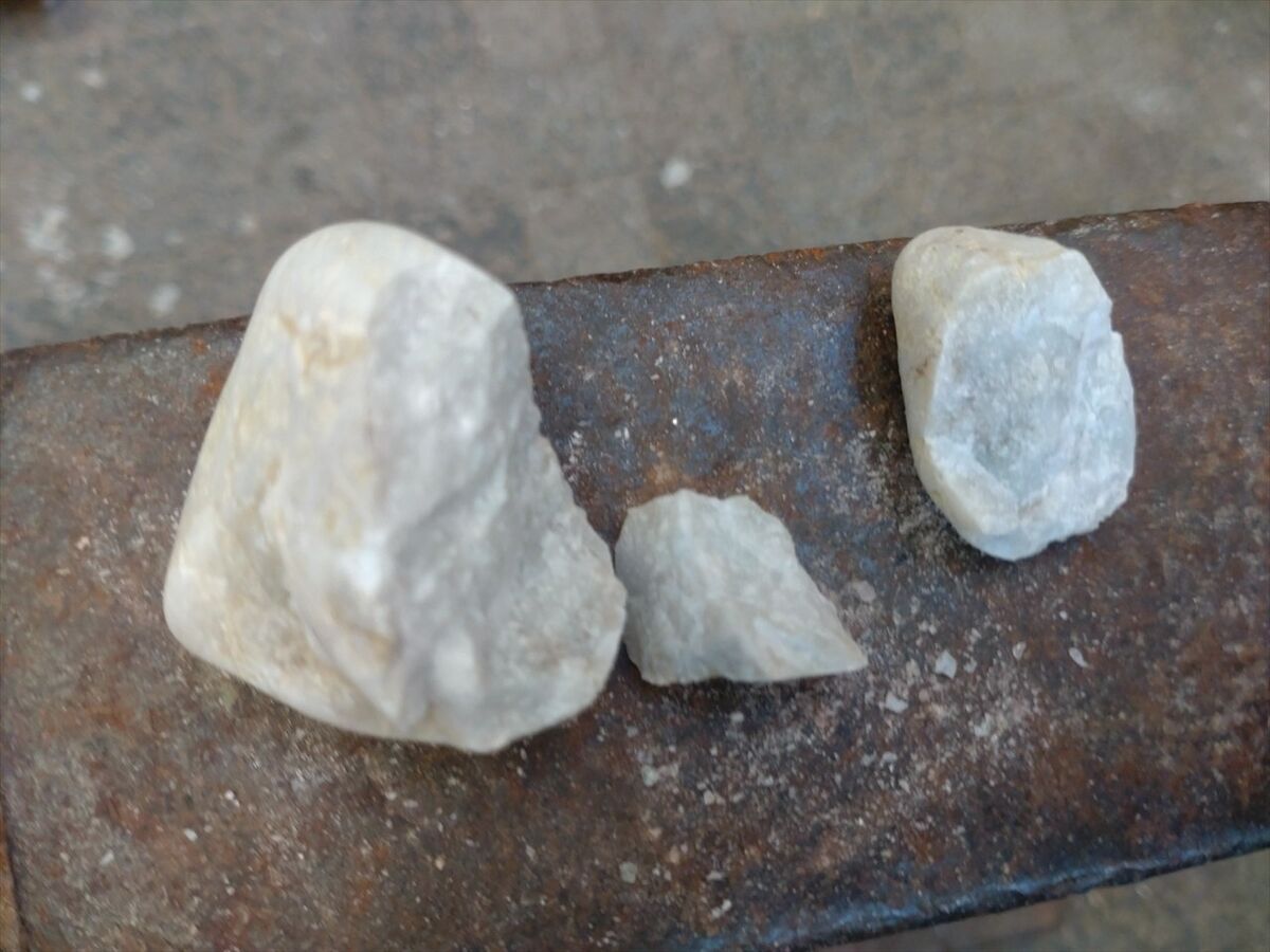 最初のは火花が少ししか出ない石で、2つ目のは良く火花が出て火打石に良さそうな石です(^^)