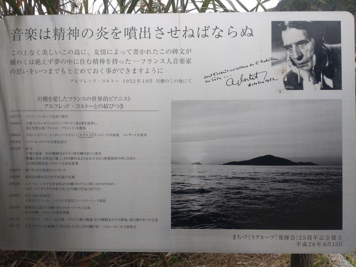 前に見える島々が厚島と呼ばれているようです。ブログ記事の後でわかりますが音楽家コルトーとの所縁のある島のようです。