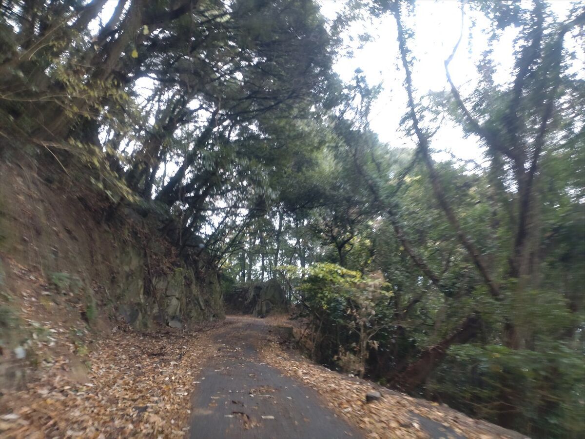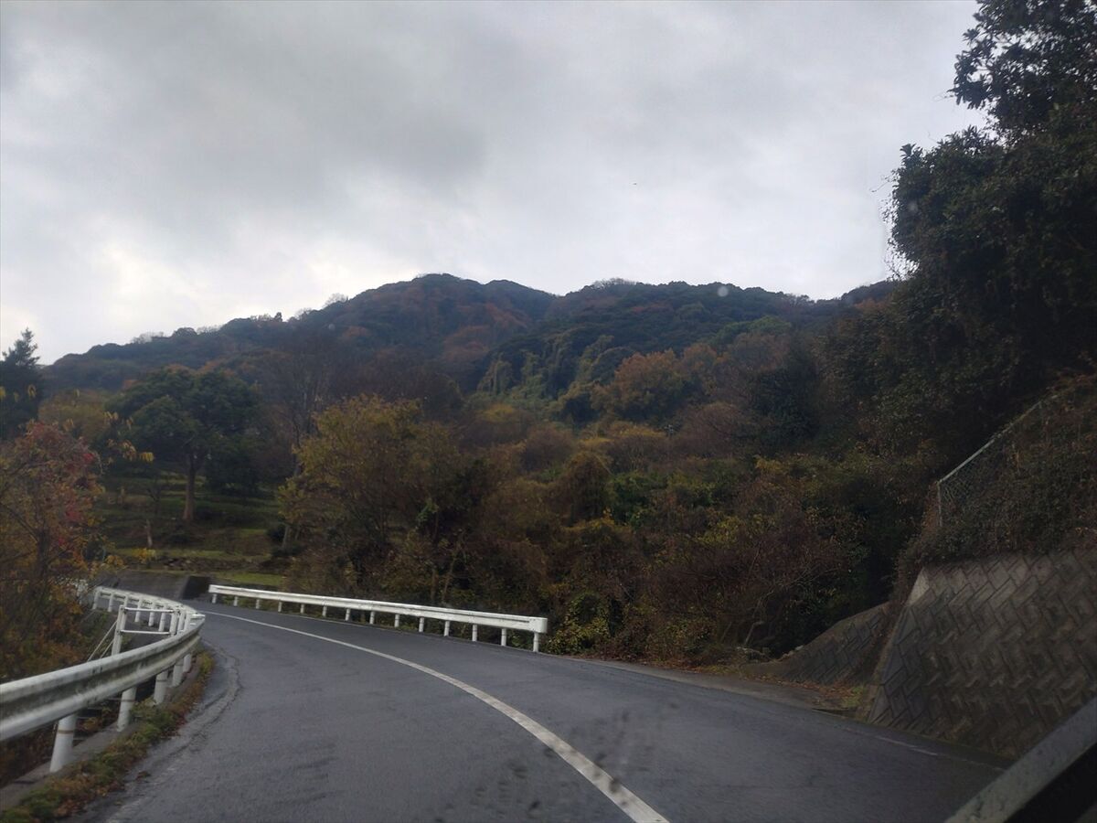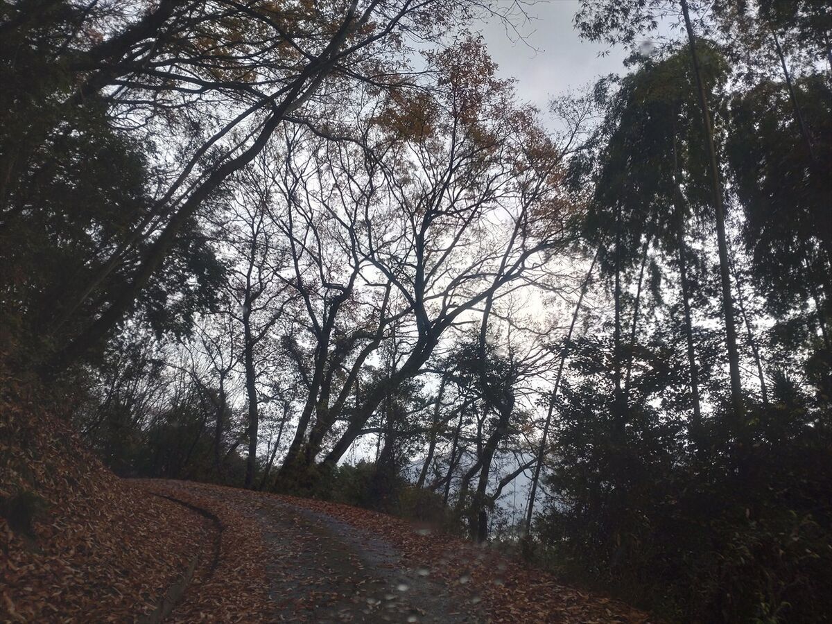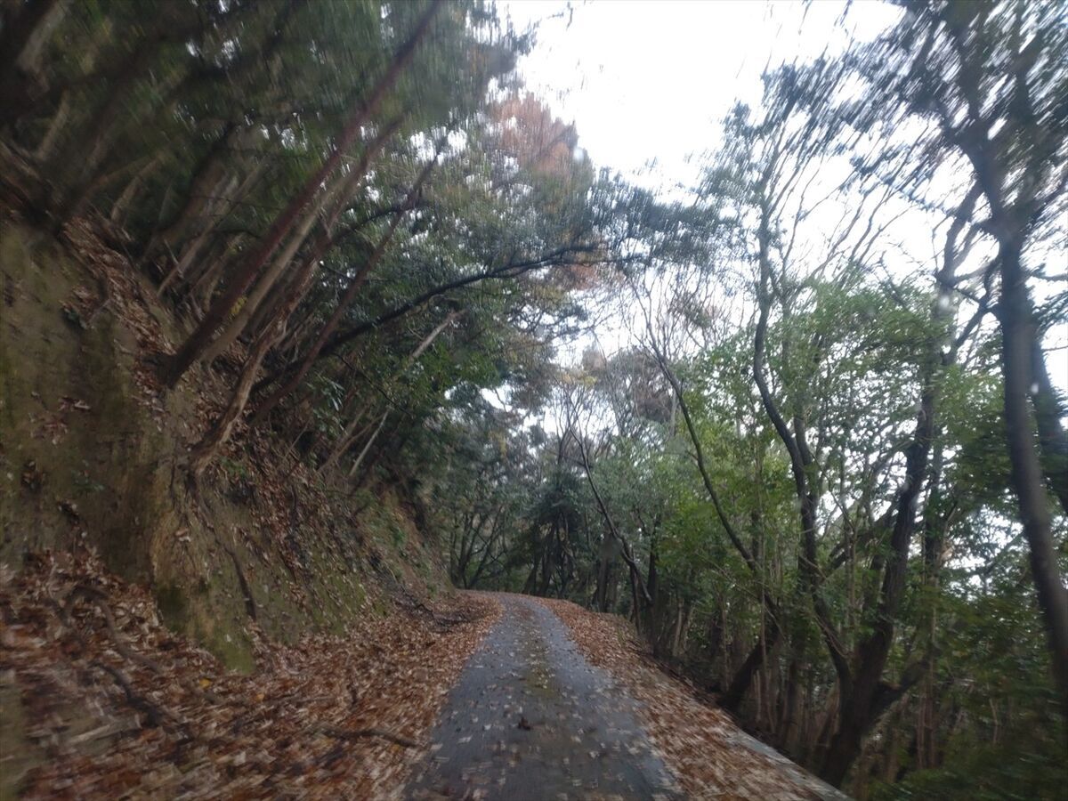 狭い山道に入りました。落ち葉が多く時々落石あっても見分けにくくタイヤで踏まないように慎重に運転していきます。