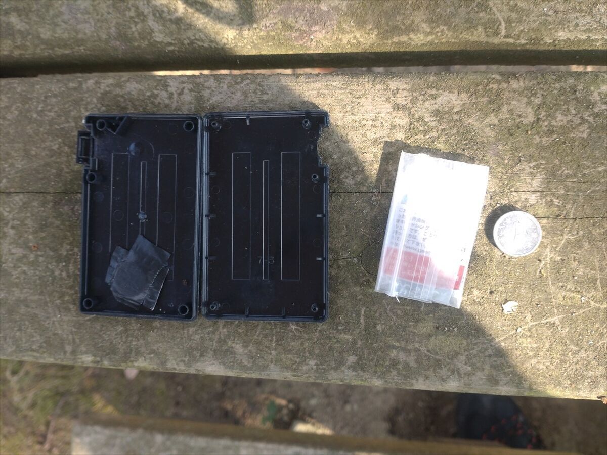 ただ今後来られる方の事を考えジオキャッシュオーナーのメンテが行われるまでの仮として、先日自作したコンテナに新しいログシートを入れてマグネットの横に設置しておきました(^^)
