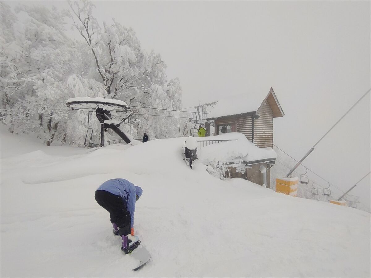 8時からの運行開始より10分ほど早く乗せていただけました。ここはボードは手持ちで乗車します。雪も降っていて視界不良ですね(^^;