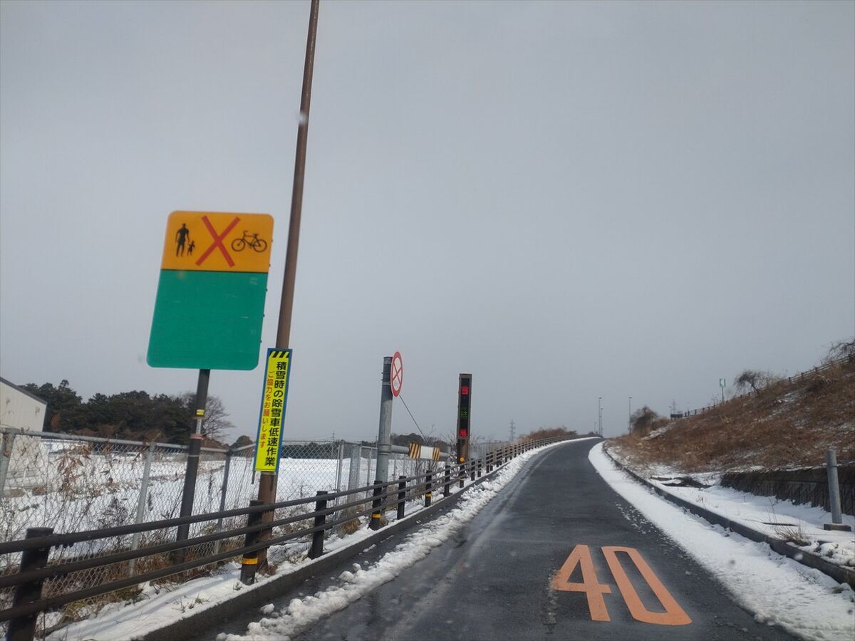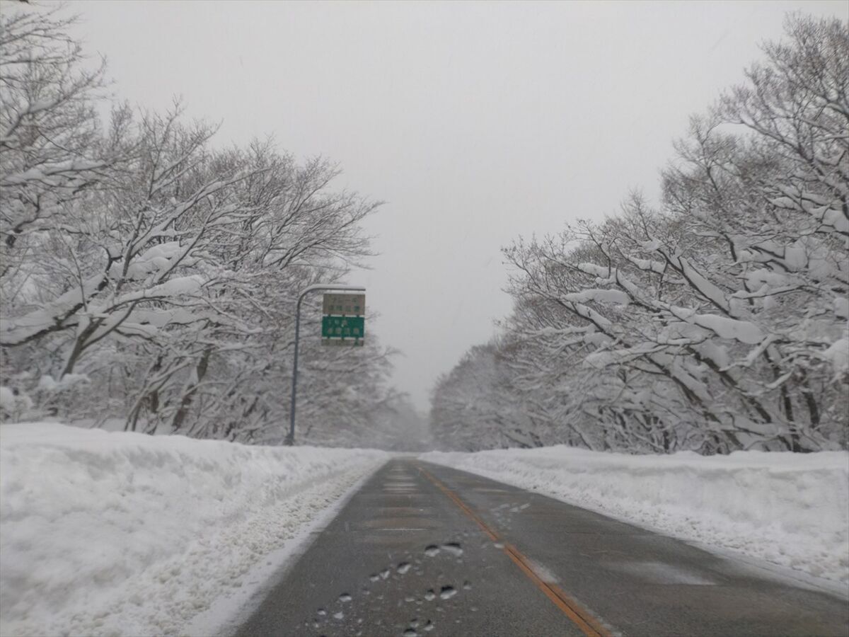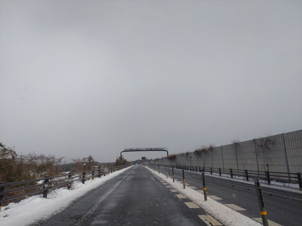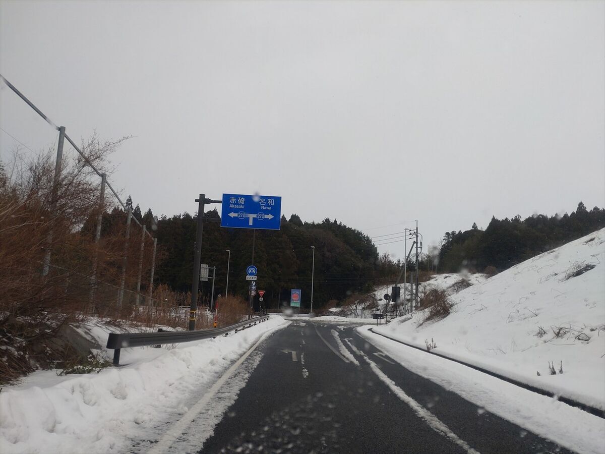 融雪区間ですね。「ブレーキ点検位置・下り坂速度注意」の標識があります。勾配がきつい坂道ですからね。