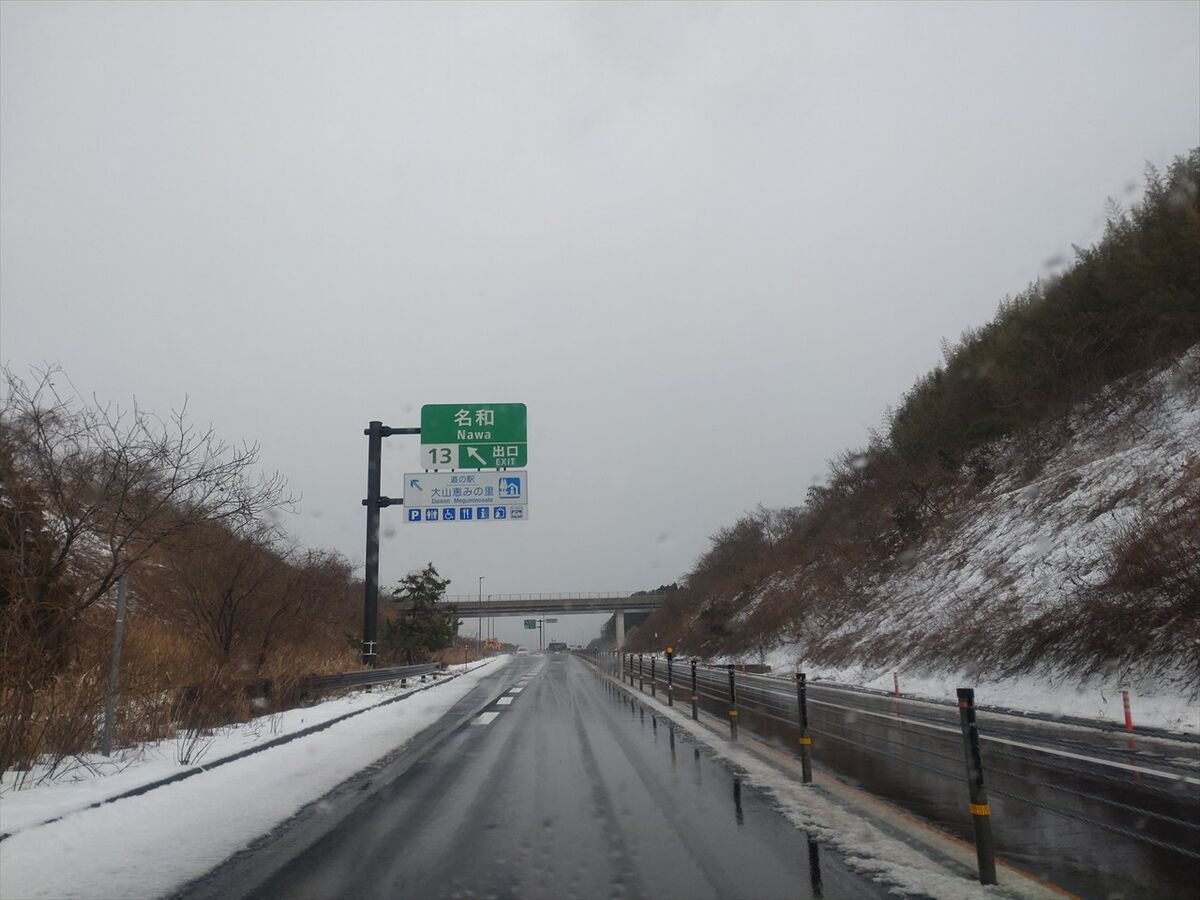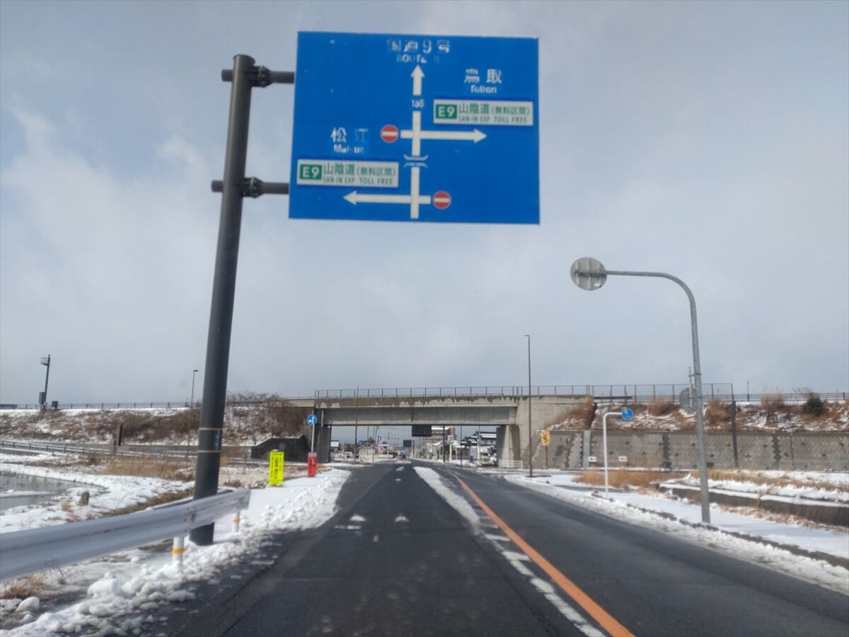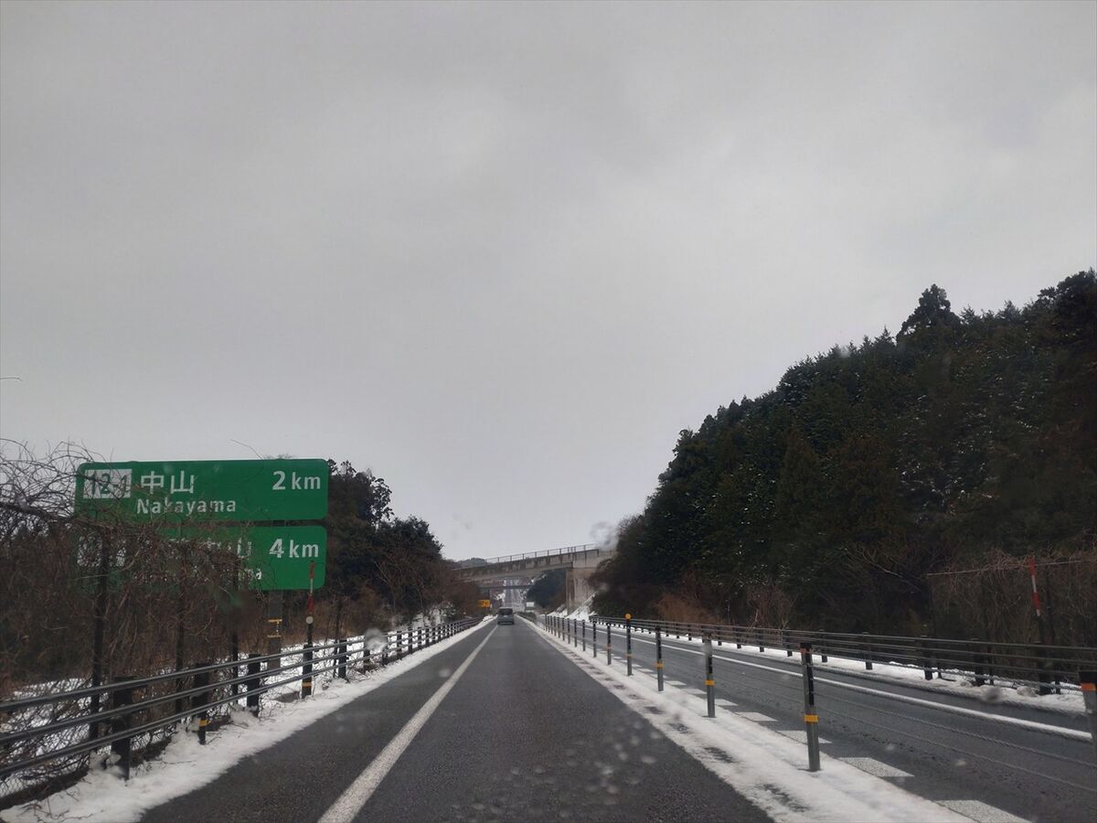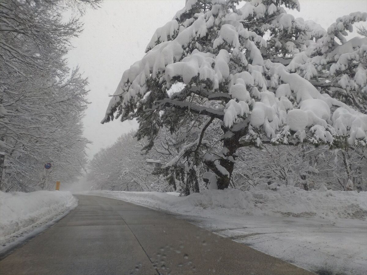 融雪区間ですね。「ブレーキ点検位置・下り坂速度注意」の標識があります。勾配がきつい坂道ですからね。