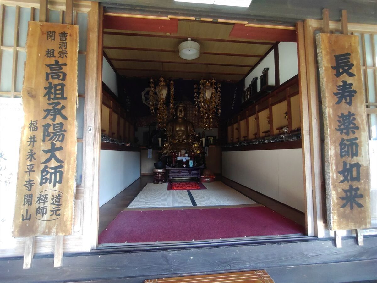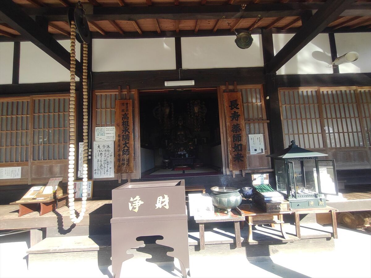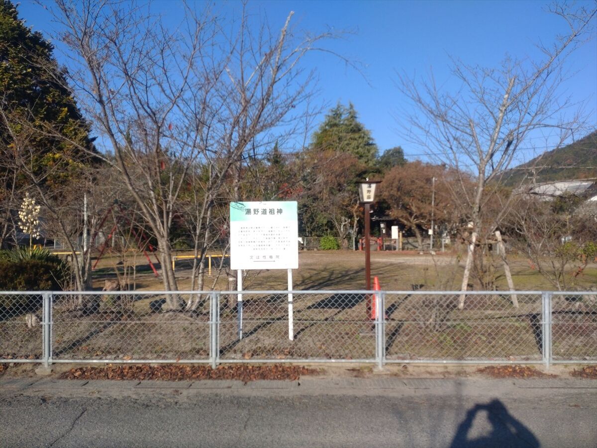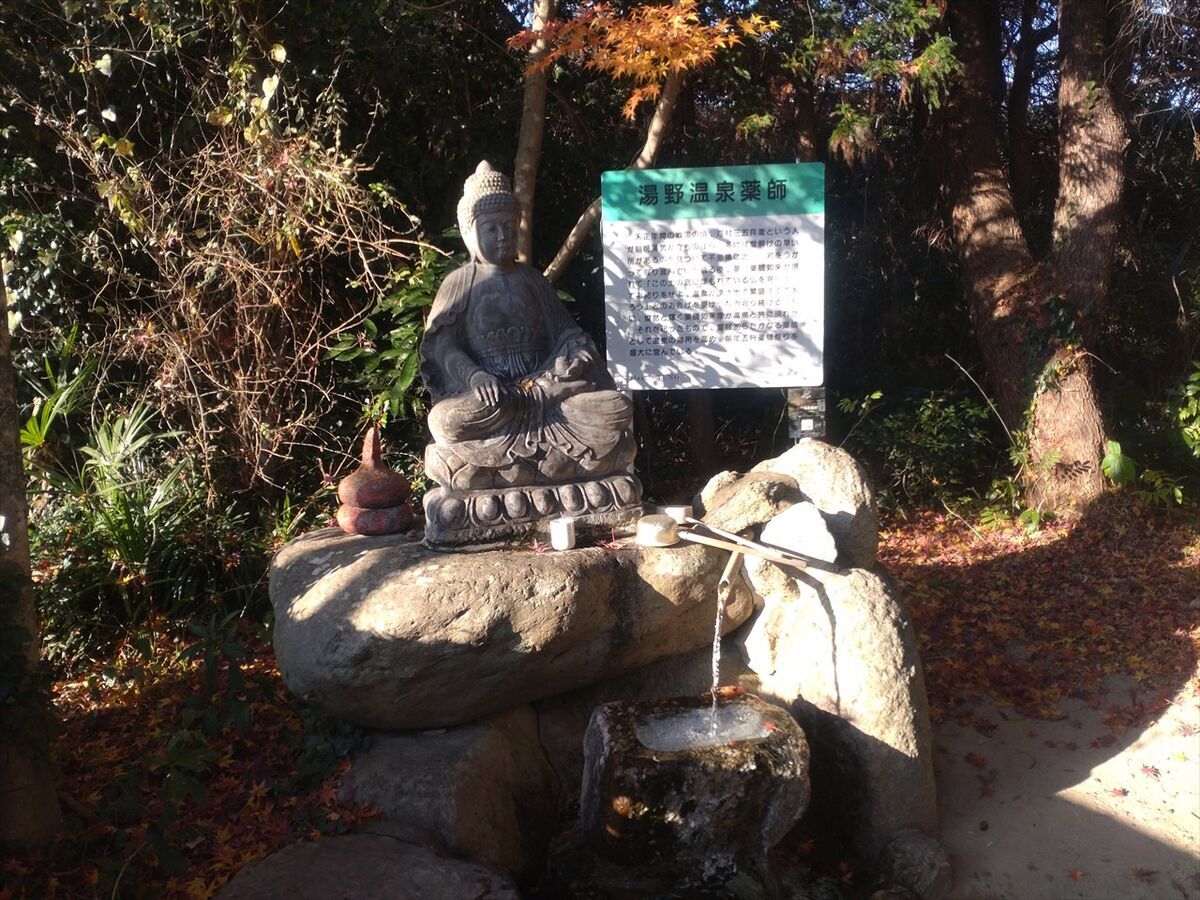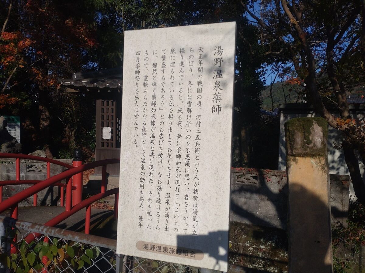 この後入浴する「湯や 晴ル音」の駐車場に車を置きます。目の前の広場の奥に湯野温泉薬師があります。