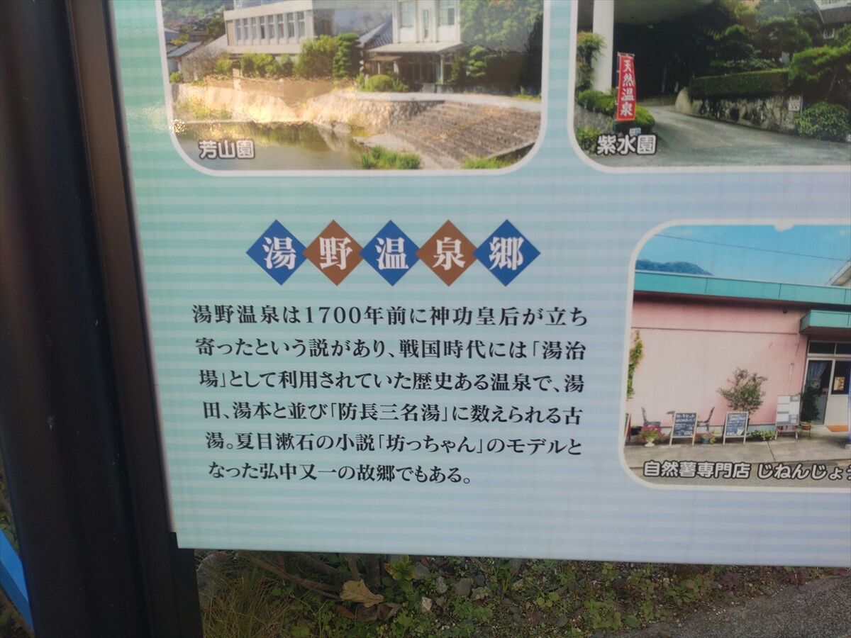湯の温泉の大きな看板があります。